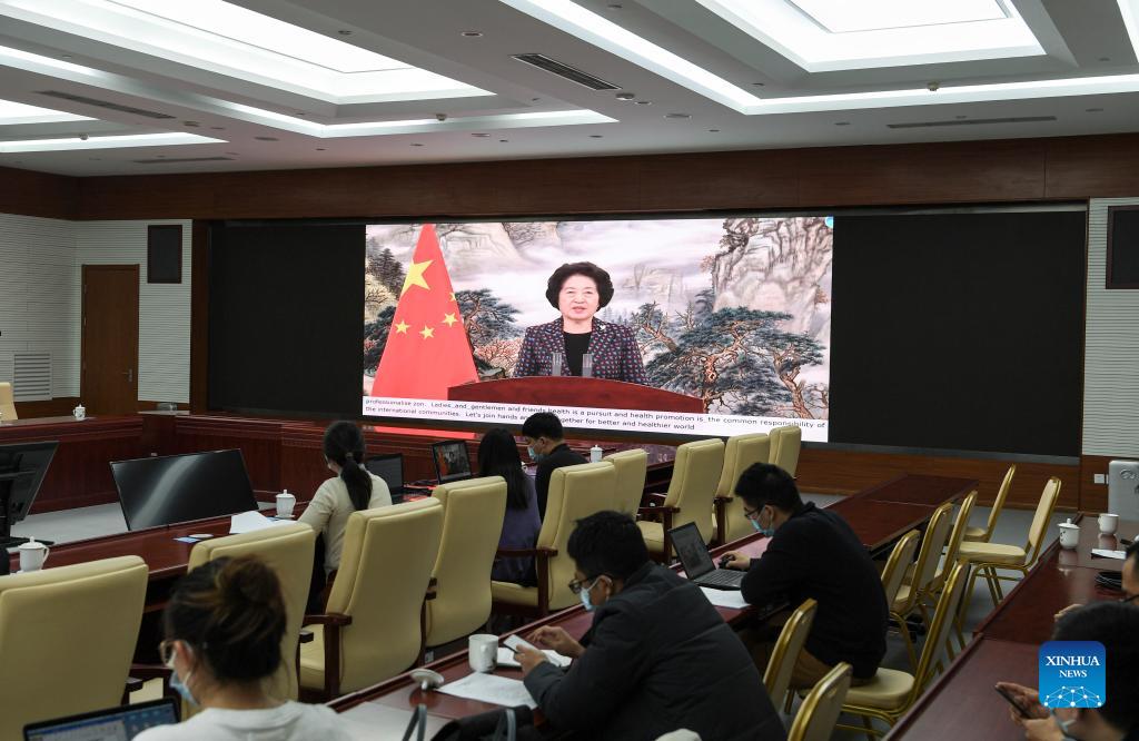 Chinese Vice Premier Sun Chunlan addresses the opening ceremony of the 10th Global Conference on Health Promotion via video on Dec. 13, 2021. (Xinhua/Yin Bogu)