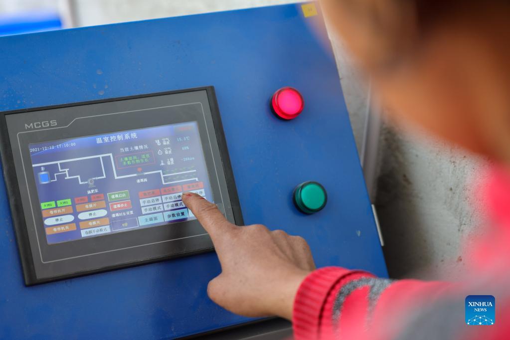 A villager operates a greenhouse control system at an industrial park in Shache County of Kashgar, northwest China's Xinjiang Uygur Autonomous Region, Dec. 12, 2021. Located in the southwestern edge of the Taklimakan Desert, Shache County has suffered from many obstacles brought by the vast desert to the economic development. In 2021, Shache County constructed an agricultural industrial park by taking advantage of the sunlight resources of the vast barren land. Greenhouses, sheep breeding bases and poultry breeding bases have been built in the industrial park, helping about 3,000 villagers find jobs nearby their homes and increase their incomes. (Xinhua/Ding Lei)