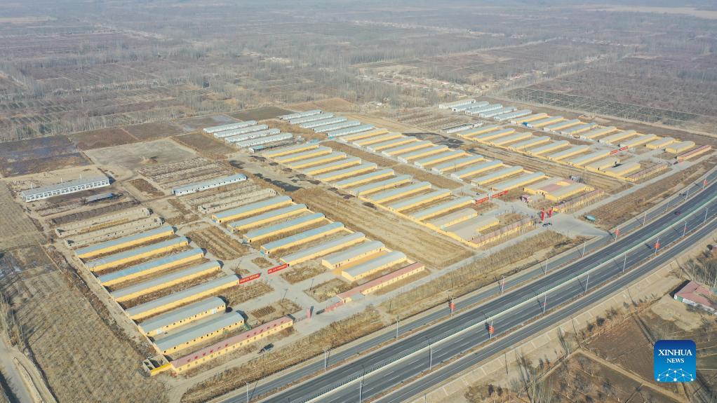 Aerial photo taken on Dec. 12, 2021 shows the poultry breeding bases of an industrial park in Shache County of Kashgar, northwest China's Xinjiang Uygur Autonomous Region. Located in the southwestern edge of the Taklimakan Desert, Shache County has suffered from many obstacles brought by the vast desert to the economic development. In 2021, Shache County constructed an agricultural industrial park by taking advantage of the sunlight resources of the vast barren land. Greenhouses, sheep breeding bases and poultry breeding bases have been built in the industrial park, helping about 3,000 villagers find jobs nearby their homes and increase their incomes. (Xinhua/Ding Lei)
