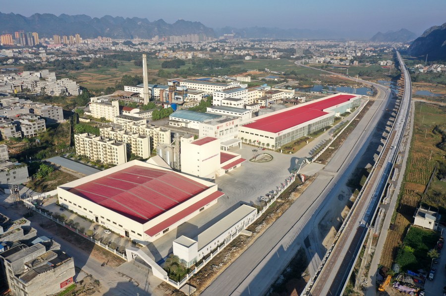 Aerial photo shows a cold-chain processing factory in Du'an Yao Autonomous County, south China's Guangxi Zhuang Autonomous Region, Dec. 1, 2021. (Xinhua/Lu Boan)