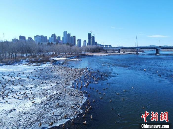 Thousands of water birds are seen roosting at the waterside of Changbai Island on the Songhua River in Jilin city, Northeast China's Jilin province. (China News Service/Cang Yan)