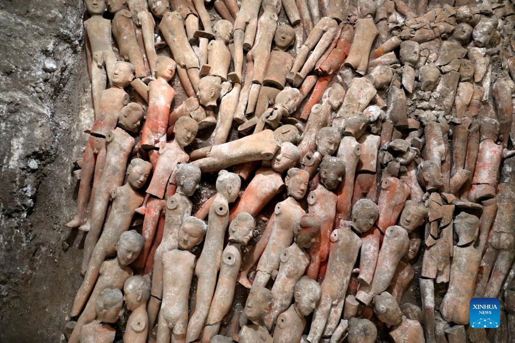 Photo taken on Oct. 8, 2021 shows pottery figurines unearthed from the mausoleum located in Jiangcun Village on the eastern outskirts of Xi'an, northwest China's Shaanxi Province. A large-scale mausoleum in Xi'an has been identified as belonging to Emperor Wendi of the Western Han Dynasty, local authorities said Tuesday. (Xinhua)