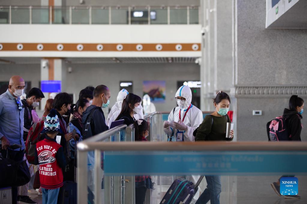 A staff member checks passengers' tickets at Vientiane Railway Station in Vientiane, Laos, Dec. 12, 2021. The China-Laos Railway created more than 110,000 jobs for Lao people during its construction. Since the railway's construction was launched, the project has drawn the interest of numerous local young talents who pursued their professional career on the railway, and many of them have grown into railway engineering masters. (Photo by Kaikeo Saiyasane/Xinhua)