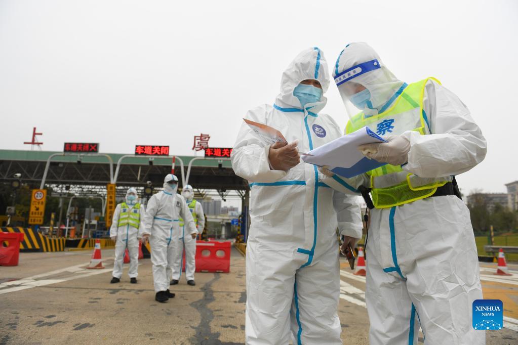 Staff members check vehicle information at the expressway exit in Shangyu District of Shaoxing, east China's Zhejiang Province, Dec. 14, 2021. (Xinhua/Weng Xinyang)