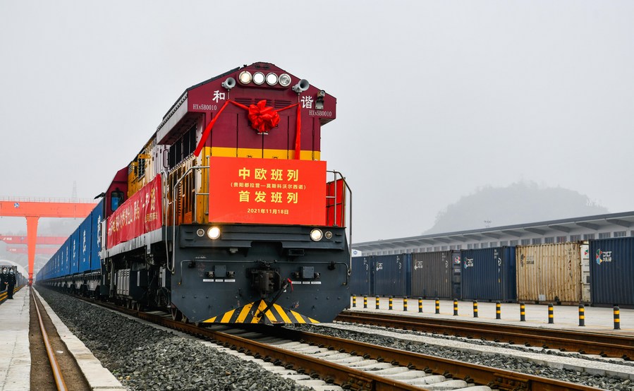 The first direct China-Europe freight train linking southwest China's Guizhou Province and Russia's Moscow pulls up in Guiyang, southwest China's Guizhou Province, Nov. 18, 2021.(Xinhua/Yang Wenbin)