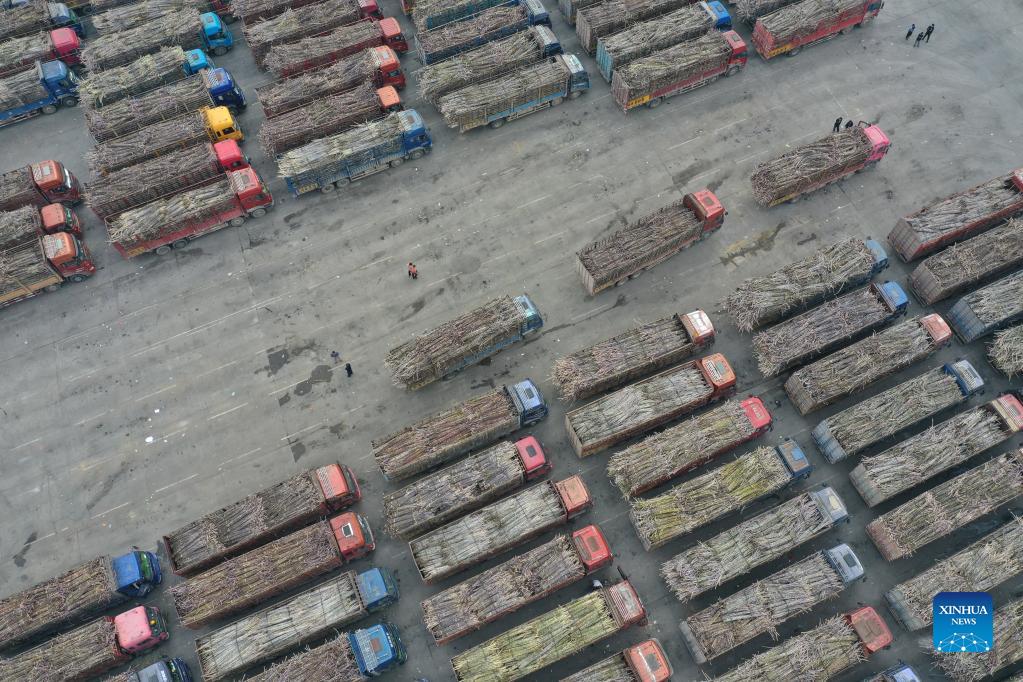 Workers unload sugarcanes at a sugar factory in Longzhou County, Chongzuo City of south China's Guangxi Zhuang Autonomous Region, Dec. 15, 2021. According to sugar industry development office of Guangxi, 66 sugar factories, nearly 90 percent of the 74 sugar factories scheduled to open this season, have started to produce sugar as of Dec. 15. (Xinhua/Zhou Hua)