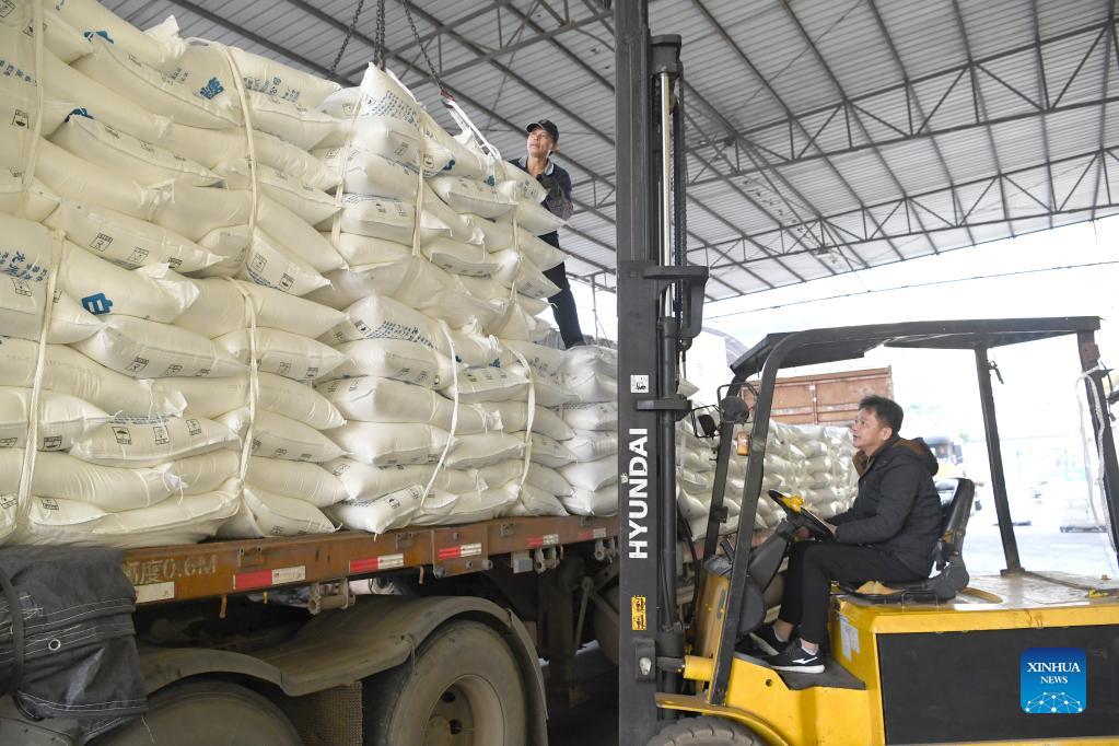 Workers transport sugar packs at a sugar factory in Longzhou County, Chongzuo City of south China's Guangxi Zhuang Autonomous Region, Dec. 15, 2021. According to sugar industry development office of Guangxi, 66 sugar factories, nearly 90 percent of the 74 sugar factories scheduled to open this season, have started to produce sugar as of Dec. 15. (Xinhua/Zhou Hua)
