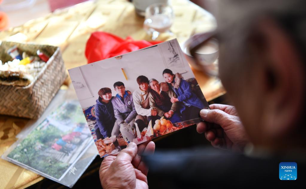 Tsering Drolma looks at a group photo of her grandchildren with her at her house in Lhasa, southwest China's Tibet Autonomous Region, Dec. 7, 2021. Tsering Drolma, born in 1940, is a retiree living in urban area of Lhasa. She was once a serf and led a miserable life in childhood. At the age of 8, she was too young to do heavy work, thus she could earn few rations from the serf owner. Apart from starvation, she had to endure the coldness as her serf owner made her sleep outdoors with livestock at night. "What a felicity it was to bathe in the sunshine a little earlier everyday. The sun is unbiased to bring its warmness to everyone," Tsering said. After the democratic reform in Tibet in 1959, Tsering's life has been greatly changed. "Starvation and coldness have gone away from my life. I have three children. Two of them have received college education," said Tsering happily. Now her retirement pension ensures her stable life. Tsering has donated money to local elderly people and people with disabilities for several times. "As my sufferings had come to an end, I've tried to offer my helping hands to those in need," she said. (Xinhua/Jigme Dorje)