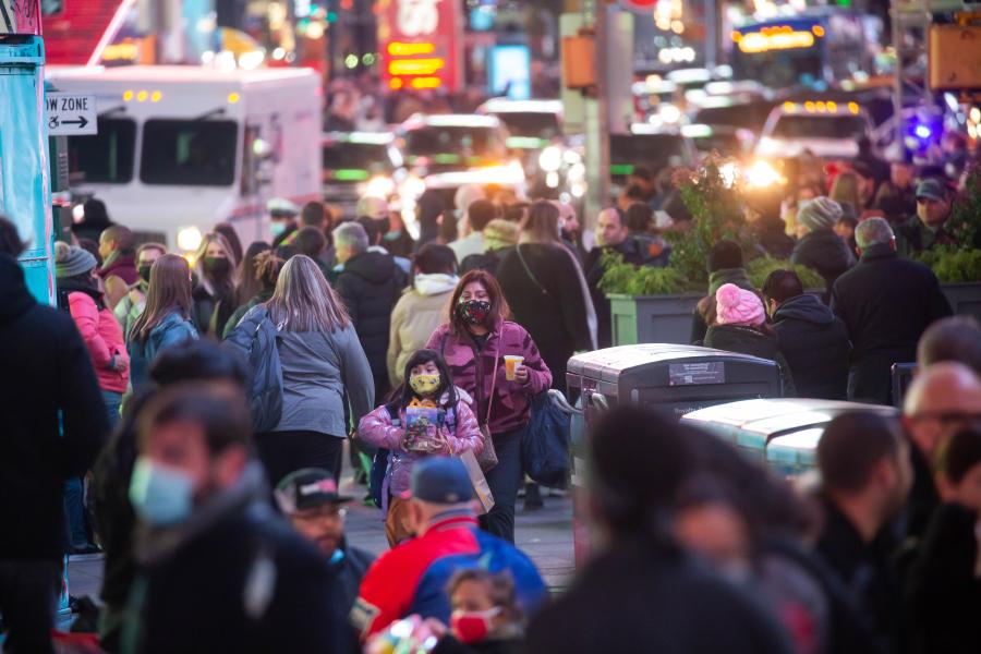 People walk through the Times Square in New York, the United States, Dec. 14, 2021.(Photo by Michael Nagle/Xinhua)