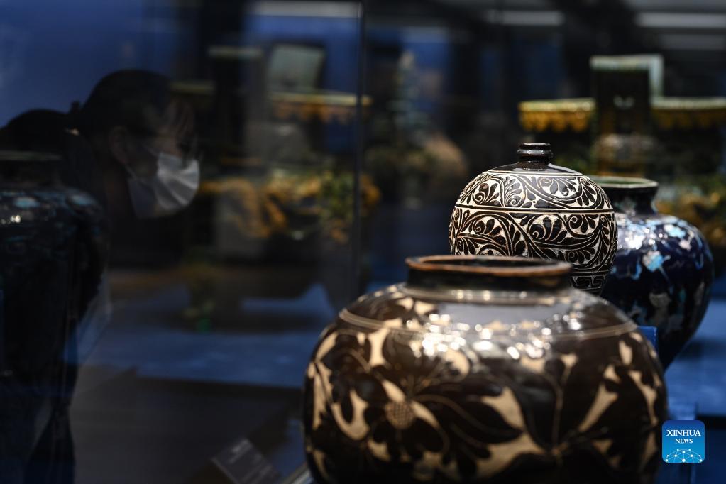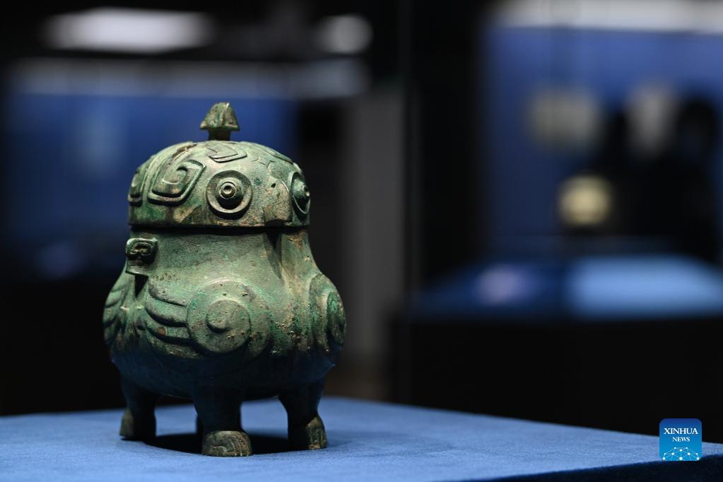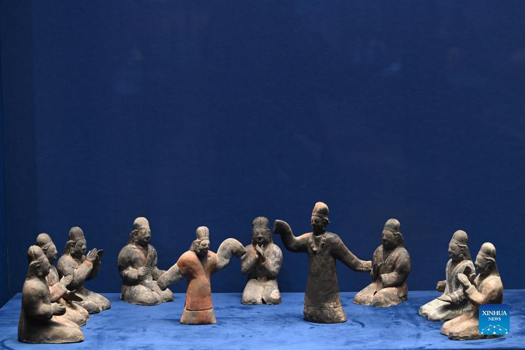 Photo taken on Dec. 15, 2021 shows cultural relics in the "Splendor of Huaxia: the Essence of Shanxi's Ancient Civilization" exhibition at Tsinghua University Art Museum in Beijing, capital of China. The exhibition lasting until Jan. 9, 2022 displays cultural relics depicting civilizations in north China's Shanxi Province in ancient times. (Xinhua/Yin Dongxun)