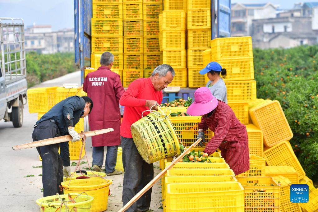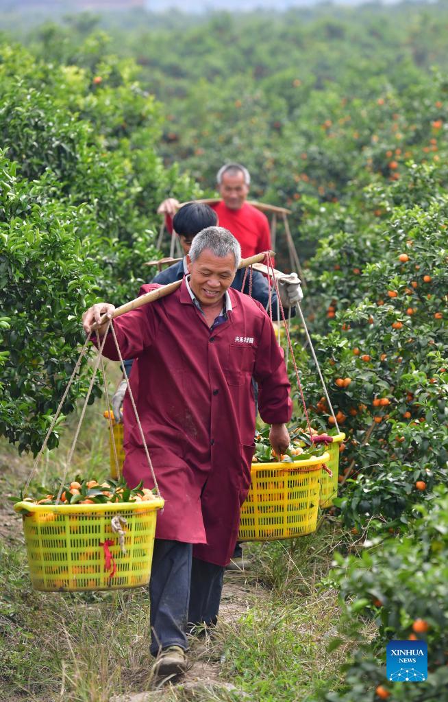 Villagers carry newly picked oranges in Luzhai County of Liuzhou City, south China's Guangxi Zhuang Autonomous Region, Dec. 16, 2021. Orange harvest season has arrived lately in Luzhai County. (Xinhua/Huang Xiaobang)