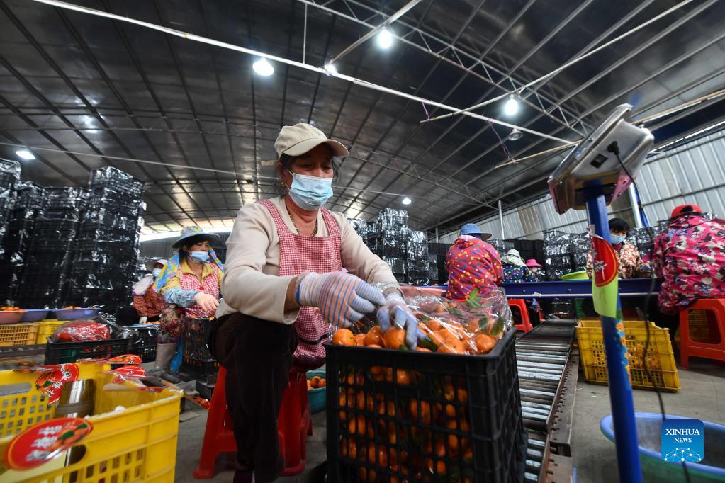Villagers pack oranges in Luzhai County of Liuzhou City, south China's Guangxi Zhuang Autonomous Region, Dec. 16, 2021. Orange harvest season has arrived lately in Luzhai County. (Xinhua/Huang Xiaobang)