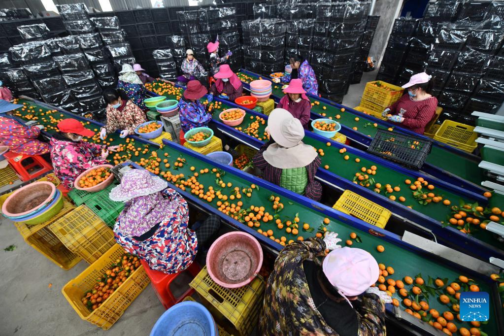 Workers select oranges on an assembly line at an orange storehouse in Luzhai County of Liuzhou City, south China's Guangxi Zhuang Autonomous Region, Dec. 16, 2021. Orange harvest season has arrived lately in Luzhai County. (Xinhua/Huang Xiaobang)