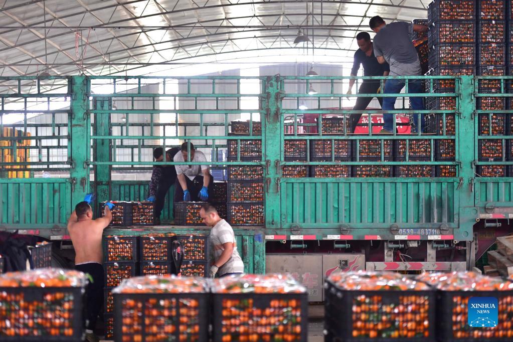 Villagers work at an orange storehouse in Luzhai County of Liuzhou City, south China's Guangxi Zhuang Autonomous Region, Dec. 16, 2021. Orange harvest season has arrived lately in Luzhai County. (Xinhua/Huang Xiaobang)