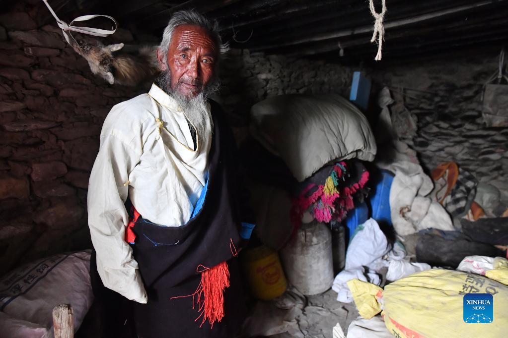 Wangyel poses for a photo at an old room which is now served as an warehouse in Qumig Village of Gyangkar Township, Dinggye County, southwest China's Tibet Autonomous Region, May 12, 2021. Wangyel, born in 1951, was once a serf leading a miserable life since childhood. He and his mother depended on each other as his father died in his thirties. Together with tens of thousands of other serfs, Wangyel embraced a brand new life in 1959, when the democratic reform was launched in Tibet and feudal serfdom was abolished. His family secured land, houses and livestock. Wangyel entered elementary school, studied medicine after graduation, and became a village doctor in his hometown. Wangyel, who is kind and obliging by nature, has been getting along well with the villagers. He later started serving as the head of the village committee and the secretary of the Communist Party of China (CPC) branch of his village. As sandstorms constantly frequented the local area, Wangyel strived for funds of sand control and organized villagers to plant trees to improve the environment. Wangyel also devoted himself to helping locals lead a better life by developing collective economy. At present, the household number of the village has grown from 18 to 206, with an average annual per capita net income of more than 10,000 yuan (about 1,571 U.S. dollars). "My parents would be very gratified to see the present life if they could live till now," said Wangyel. (Xinhua/Sun Ruibo)