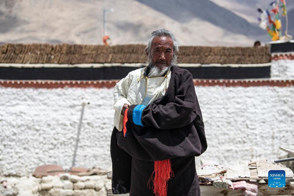 Photo taken on May 12, 2021 shows a portrait of Wangyel in Qumig Village of Gyangkar Township, Dinggye County, southwest China's Tibet Autonomous Region. Wangyel, born in 1951, was once a serf leading a miserable life since childhood. He and his mother depended on each other as his father died in his thirties. Together with tens of thousands of other serfs, Wangyel embraced a brand new life in 1959, when the democratic reform was launched in Tibet and feudal serfdom was abolished. His family secured land, houses and livestock. Wangyel entered elementary school, studied medicine after graduation, and became a village doctor in his hometown. Wangyel, who is kind and obliging by nature, has been getting along well with the villagers. He later started serving as the head of the village committee and the secretary of the Communist Party of China (CPC) branch of his village. As sandstorms constantly frequented the local area, Wangyel strived for funds of sand control and organized villagers to plant trees to improve the environment. Wangyel also devoted himself to helping locals lead a better life by developing collective economy. At present, the household number of the village has grown from 18 to 206, with an average annual per capita net income of more than 10,000 yuan (about 1,571 U.S. dollars). "My parents would be very gratified to see the present life if they could live till now," said Wangyel. (Xinhua/Sun Ruibo)