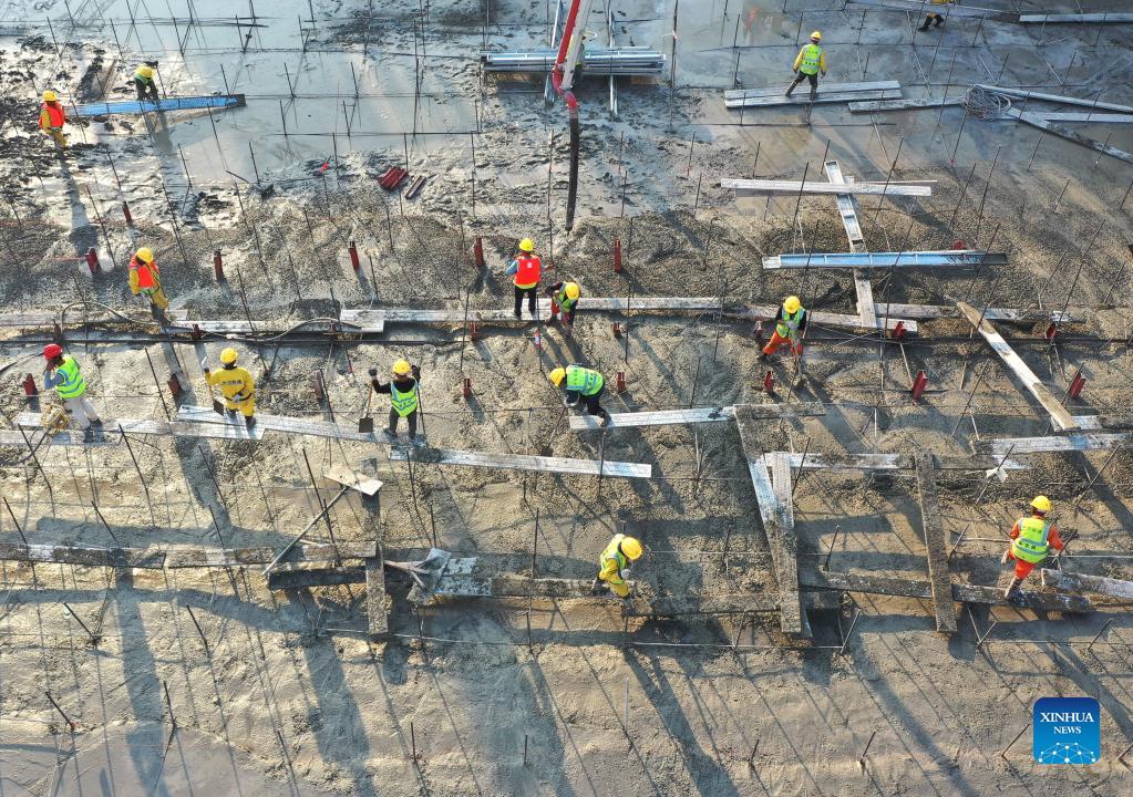 Photo taken on Dec. 16, 2021 shows the construction site of the Longmen Bridge in Qinzhou City, south China's Guangxi Zhuang Autonomous Region. Located in the city of Qinzhou, the Longmen Bridge, a cross-sea bridge serving as a part of an expressway connecting coastal cities along the Beibu Gulf of Guangxi, stretches 7.6 km, with the main bridge span measuring 1,098 meters in length. (Xinhua/Zhou Hua)