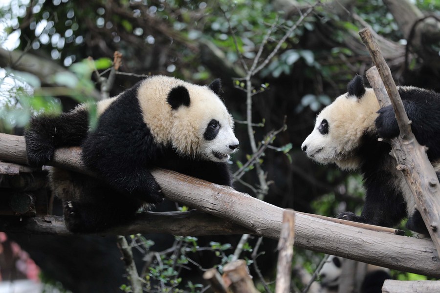 Two giant pandas are pictured at Chengdu Research Base of Giant Panda Breeding during a theme event marking International Panda Day in Chengdu, southwest China's Sichuan Province, Oct. 27, 2020. (Xinhua/Xu Bingjie)