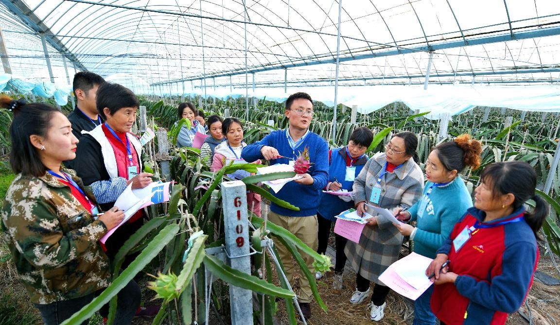 An agronomist gives a lesson in a greenhouse of a pitaya production base in Changfeng township, Yingjiang district, Anqing, east China's Anhui province, Dec. 1, 2021. (People's Daily Online/Huang You'an)