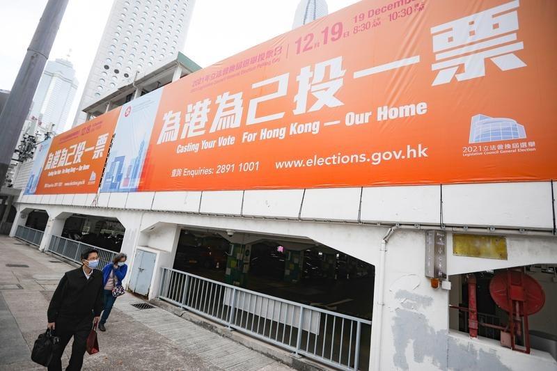 A giant banner that reads "Cast your vote for Hong Kong — our home" is seen in the Central district in Hong Kong, Dec 15, 2021. [Photo by CALVIN NG/For CHINA DAILY]