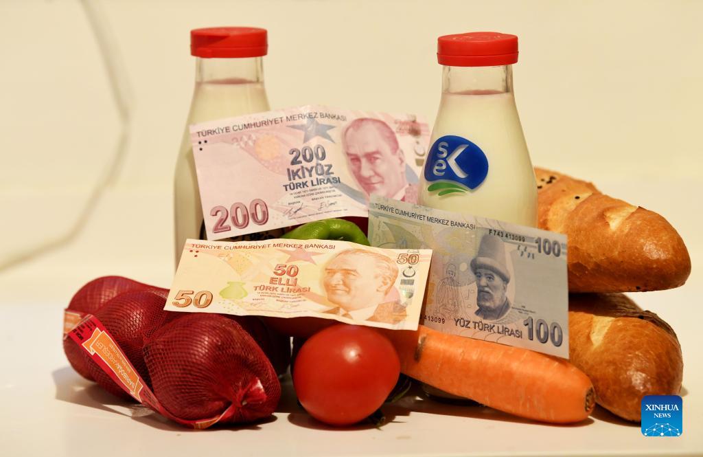 Photo taken on Dec. 17, 2021 shows some Turkish lira and food in Istanbul, Turkey. The Turkish currency crashed to a new record low of 17.16 per U.S. dollar on Friday after the central bank cut the interest rate again. (Xinhua/Shadati)
