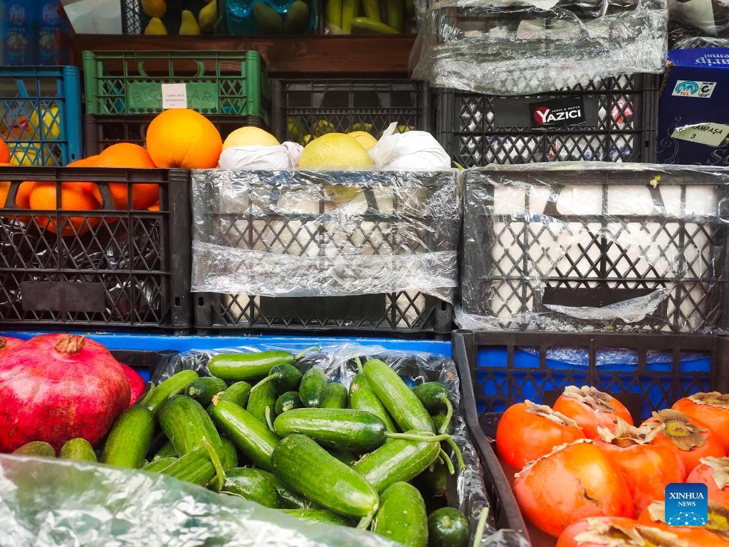 Photo taken on Dec. 17, 2021 shows fruits and vegetables for sale at a store in Istanbul, Turkey. The Turkish currency crashed to a new record low of 17.16 per U.S. dollar on Friday after the central bank cut the interest rate again. (Xinhua/Shadati)