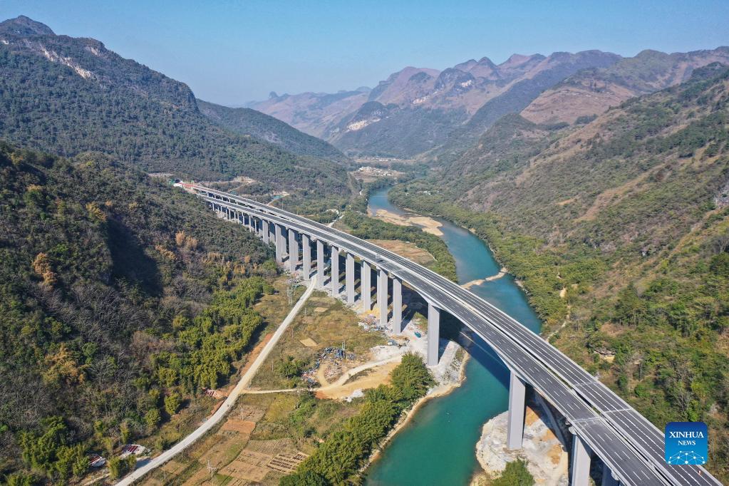 Aerial photo taken on Dec. 19, 2021 shows the Qinglian grand bridge in Lianzhou City of Qingyuan, south China's Guangdong Province. The Guangzhou-Lianzhou Expressway starts from Huadu District of Guangzhou and ends in Lianzhou City of Qingyuan, connecting with Yueyang-Linwu Expressway of Hunan. The main project will be opened to traffic by the end of 2021. After completion, it will further improve the inter-provincial corridor between Guangdong and Hunan and promote the integration of mountainous areas in northern Guangdong into the Guangdong-Hong Kong-Macao Greater Bay Area. (Xinhua/Liu Dawei)