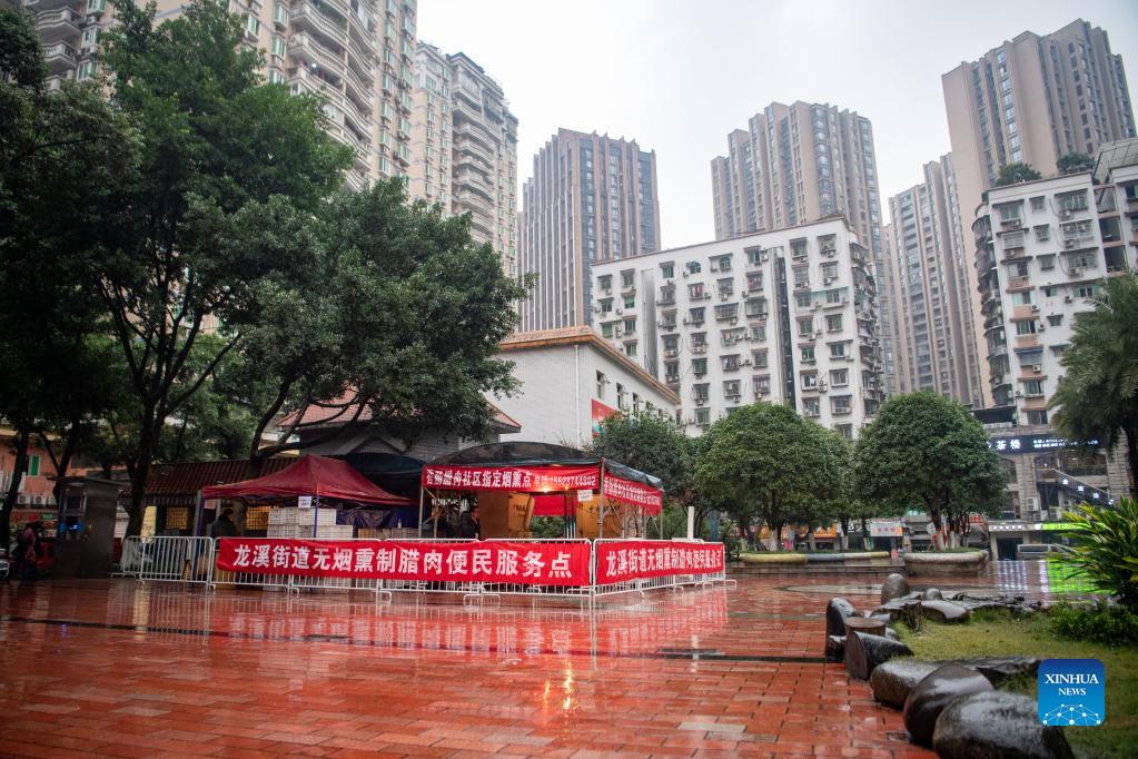 Photo taken on Dec. 18, 2021 shows a service point with smokeless ovens set up for smoked meat making in Yubei District, southwest China's Chongqing Municipality. Smoked meat is widely made and consumed by local people in Chongqing as a common preparation for the Spring Festival. A batch of smokeless ovens developed by environmental protection equipment enterprises have been set up in residential areas of Chongqing to help reduce air pollution during the making process of smoked meat. Air cleaning devices attached to the oven could highly reduce the concentration of particulate matter and oil smoke released by the oven. (Xinhua/Tang Yi)