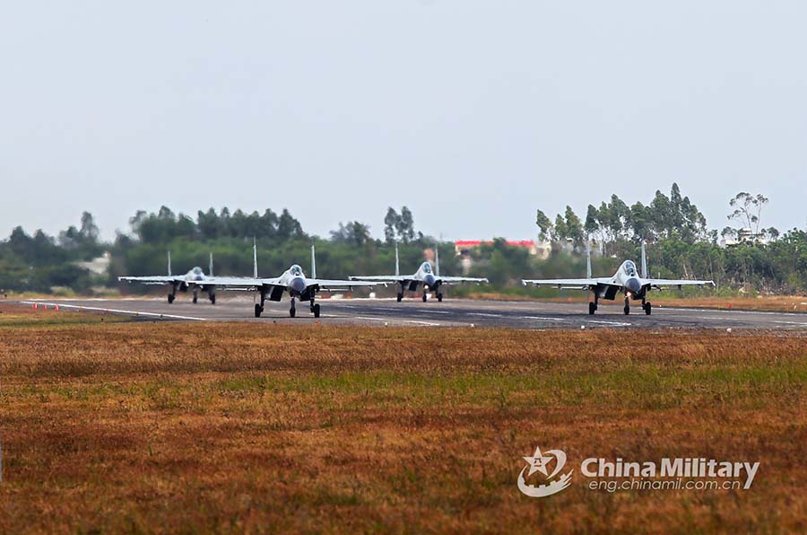Fighter jets attached to a naval aviation brigade under the PLA Southern Theater Command participate in a close formation taxi known as an "elephant walk" during a flight training exercise on December 9, 2021. (eng.chinamil.com.cn/Photo by Deng Zeming)