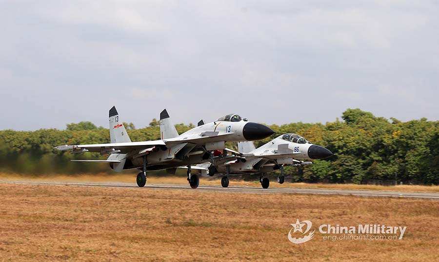 Fighter jets attached to a naval aviation brigade under the PLA Southern Theater Command take off during a flight training exercise on December 9, 2021. (eng.chinamil.com.cn/Photo by Deng Zeming)