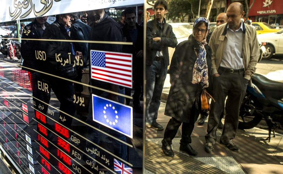 People look at a board showing the rates of currencies at a currency exchange center in central Tehran, Iran, on Nov. 1, 2018. (Xinhua/Ahmad Halabisaz)