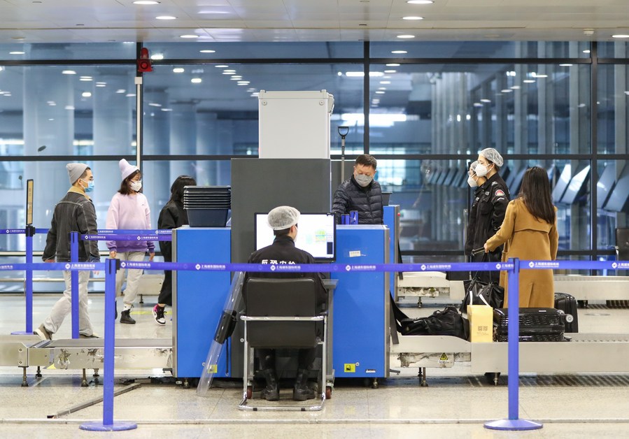 Passengers pass security checkpoint at Terminal 2 building of the Shanghai Pudong International Airport in east China's Shanghai, Nov. 24, 2020.(Xinhua/Ding Ting)