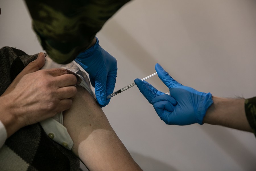 A medical worker administers the COVID-19 vaccine at a vaccination center in Athens, Greece, on April 2, 2021. (Photo by Lefteris Partsalis/Xinhua)