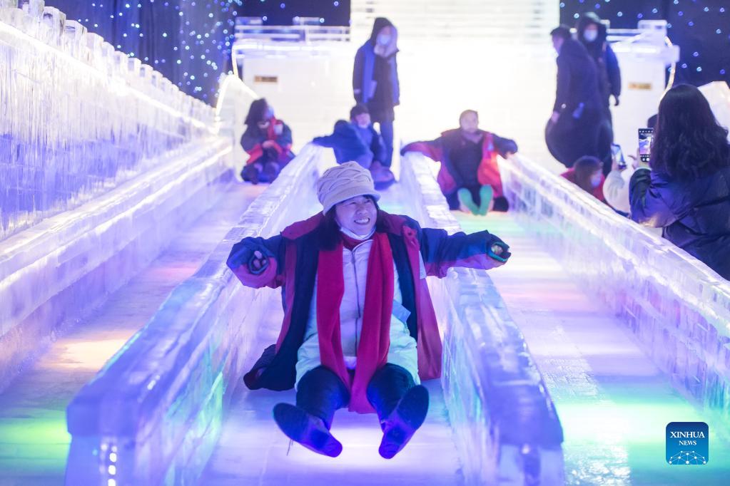 Visitors play on an ice slide at an ice and snow art festival in Wuhan, capital of central China's Hubei Province, Dec. 21, 2021. As part of the 8th National Public Ice and Snow Season, the ice and snow art festival kicked off here on Tuesday. (Xinhua/Xiao Yijiu)