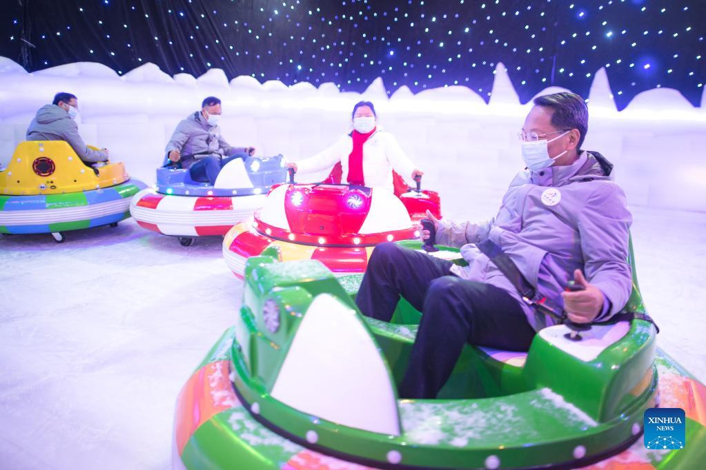 Visitors play bumper cars at an ice and snow art festival in Wuhan, capital of central China's Hubei Province, Dec. 21, 2021. As part of the 8th National Public Ice and Snow Season, the ice and snow art festival kicked off here on Tuesday. (Xinhua/Xiao Yijiu)