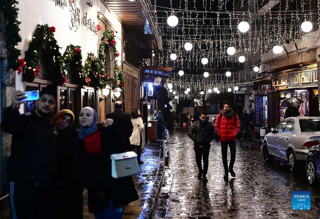 People enjoy the holiday atmosphere at night in Damascus, capital of Syria, Dec. 20, 2021. (Photo by Ammar Safarjalani/Xinhua)