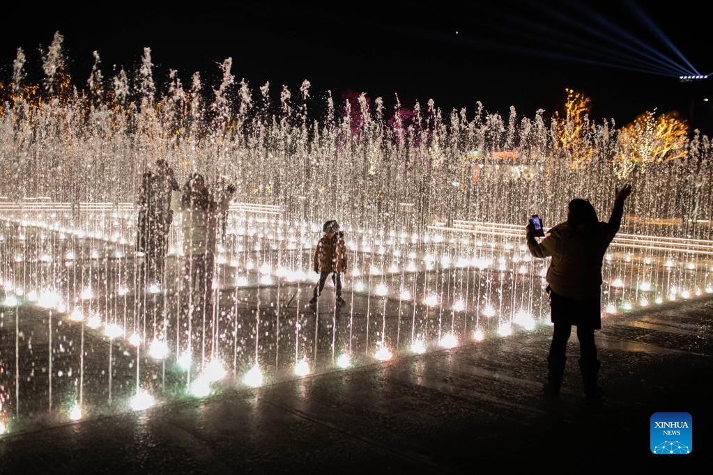 People stand around a fountain at the Experience Park in Elliniko in Athens, Greece, Dec. 20, 2021. The Experience Park opened to the public on Monday with decorations for the festive season. (Photo by Lefteris Partsalis/Xinhua)