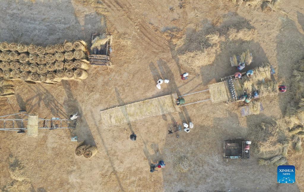 Photo taken on Dec. 21, 2021 shows workers processing rice straw at a processing site in Xige Town, Fengnan district of Tangshan city, north China's Hebei Province. In recent years, local farmers have been guided to recycle straw. Straw previously used as firewood can be put to other uses, such as weaving or papermaking, or to produce organic fertilizer. Being more economical with the use of straw for recycling not only protects the environment, but helps increase farmers' income. (Xinhua/Yang Shiyao)