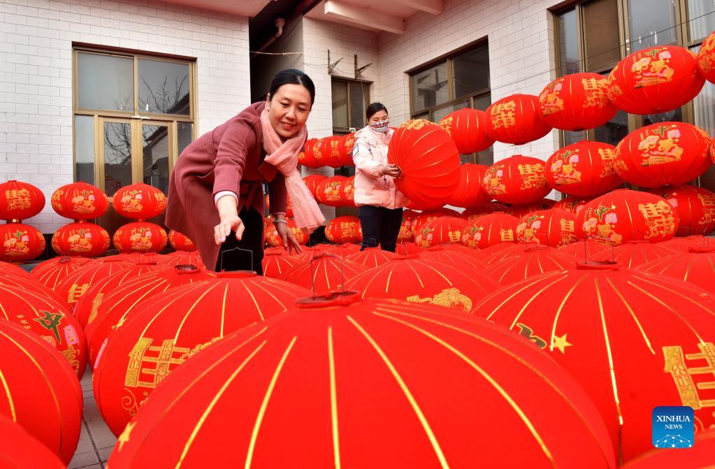 Staff members work at a lantern workshop in Dongsanzhao Township of Nanhe District of Xingtai, north China's Hebei Province, Dec. 22, 2021. Villagers are busy making lanterns for the upcoming festival season. (Xinhua/Zhu Xudong)