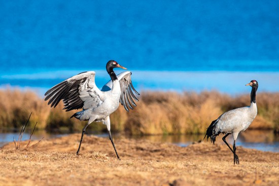 Black-necked cranes play at the Dashanbao Dahaizi Wetland in Zhaotong city, southwest China’s Yunnan Province, Feb. 24, 2021. (Xinhua/Hu Chao)