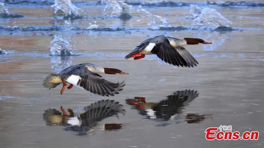 Mergansers skim over the river in Zhangxian County, Dingxi City, northwest China's Gansu Province. (Photo: China News Service/Ma Tianyun)