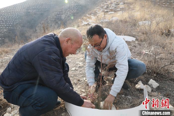 Hao Jingxiang and his son check on the growth of a sapling. (Chinanews.com/Wang Jufen)