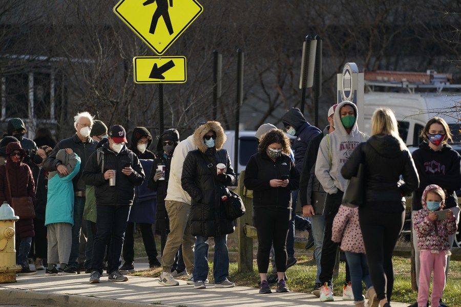 People line up to receive COVID-19 test in Arlington, Virginia, the United States on Dec. 22, 2021. (Photo by Ting Shen/Xinhua)