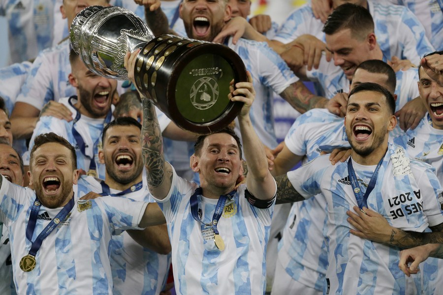 Messi (middle) celebrates with teammates after winning the 2021 Copa America football tournament final match against Brazil in Rio de Janeiro, Brazil, on July 10, 2021. (Xinhua/Lucio Tavora)
