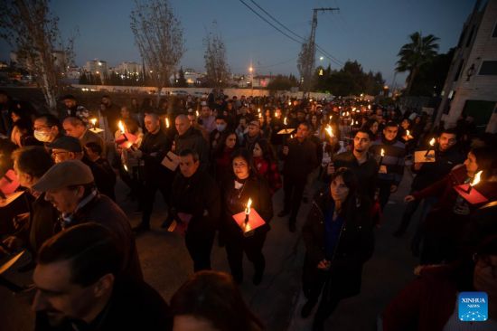 People take part in the candle march on the Christmas Day in Beit Sahour near the West Bank city of Bethlehem, on Dec. 25, 2021. (Photo by Luay Sababa/Xinhua)
