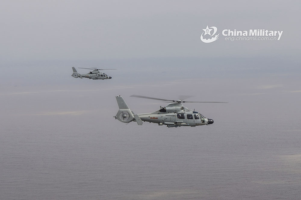 Ship-borne helicopters attached to a naval aviation regiment under the PLA Eastern Theater Command fly over the islands during a flight training mission on December 8, 2021. (eng.chinamil.com.cn/Photo by Li Hengjiang)