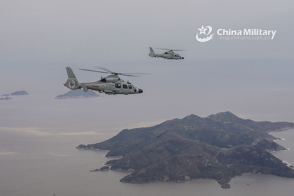 Ship-borne helicopters attached to a naval aviation regiment under the PLA Eastern Theater Command fly over the islands during a flight training mission on December 8, 2021. (eng.chinamil.com.cn/Photo by Li Hengjiang)