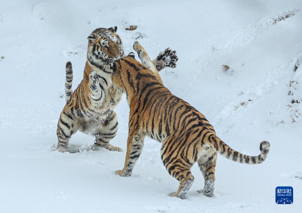 Photo taken on Dec. 26, 2021 shows two tigers playing in the snow at a zoo in Rongcheng, east China's Shandong Province. (Xinhua/Li Xinjun)