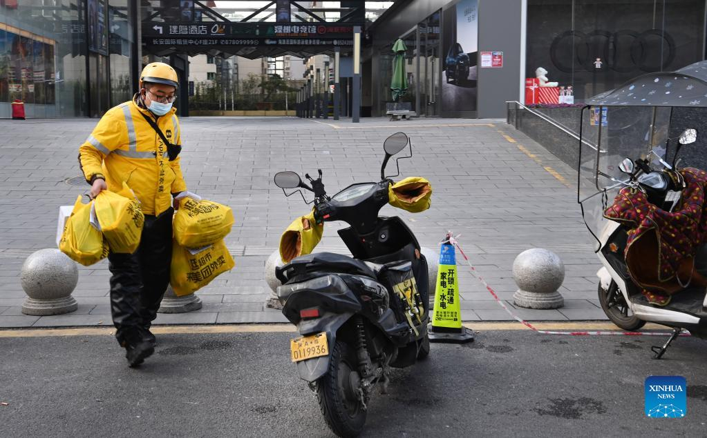 A deliveryman sends goods in Xi'an, northwest China's Shaanxi Province, Dec. 26, 2021. Xi'an imposed closed-off management for communities and villages last Thursday to curb the spread of the latest COVID-19 resurgence. (Xinhua/Tao Ming)