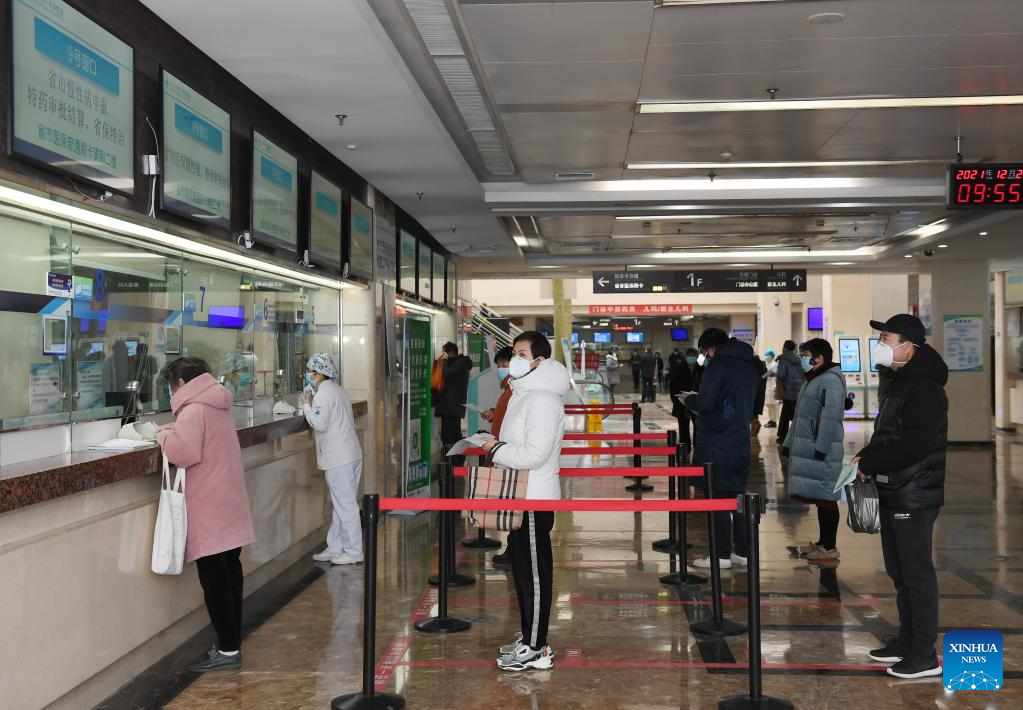 Patients wait in lines at the 1st Affiliated Hospital of Xi'an Jiaotong University in Xi'an, northwest China's Shaanxi Province, Dec. 27, 2021. Two hospitals affiliated to Xi'an Jiaotong University have resumed outpatient and emergency services with strict epidemic prevention and control measures, as the city is coping with a recent resurgence of COVID-19. (Xinhua/Li Yibo)